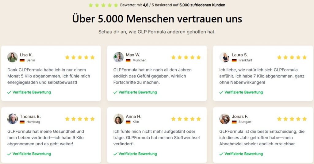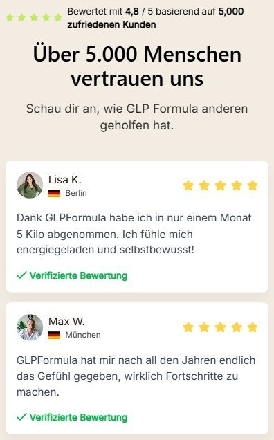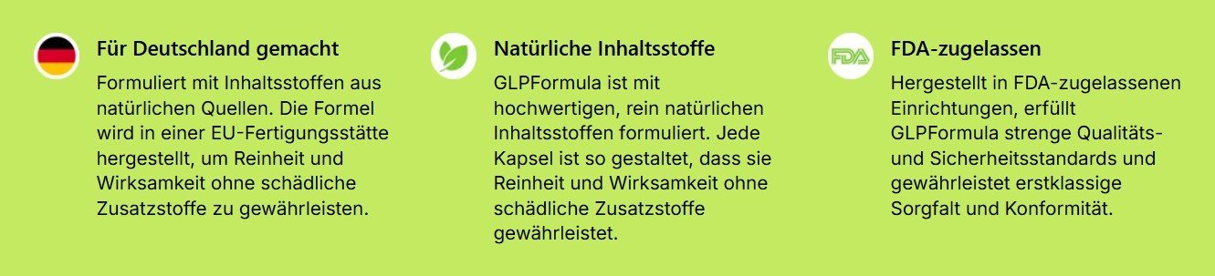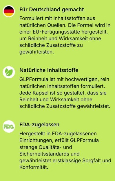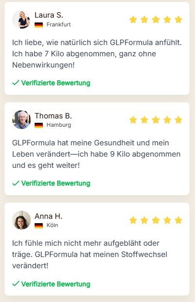Verpassen Sie nicht die Chance, die 100% natürlichen Vorteile der GLP Formula selbst zu erleben! Warten Sie nicht länger, um hartnäckige Fettpolster zu verbannen, Ihre Energie zu steigern und die volle Kontrolle über Ihren Körper zu übernehmen – rund um die Uhr.